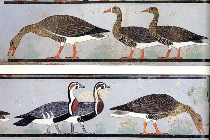 С падением древнеегипетского царства секрет одомашнивания гусей потеряли. Птах быстро одичал, но вот к домашнему зерновому протеину страсть осталась. С тех пор наши герои связались с плохой компанией и считаются сельхозвредителями.