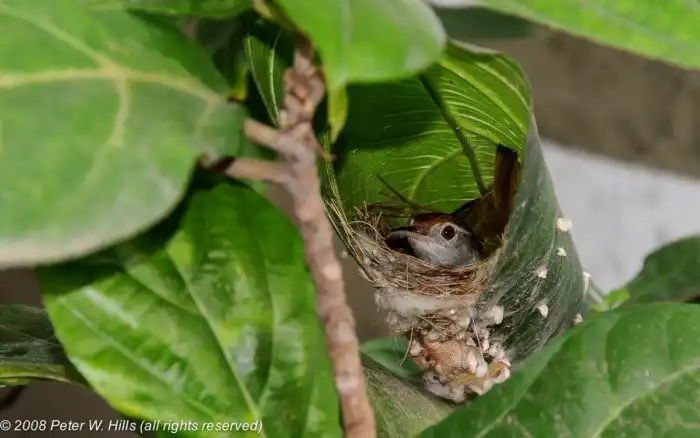 Получившееся строение пусть и весьма крепко, но разбить его возможно. А вот гнёзда краснолобых портних из Поднебесной уничтожить не получится, ведь они защищены грамотным камуфляжем. Ловкими движениями клюва-иглы птахи сшивают несколько листьев с помощью стебельков, соломинок и пучков паутины. В итоге получается незаметный для врагов закуточек, где можно обустроить маленькое и аккуратное гнездо.
