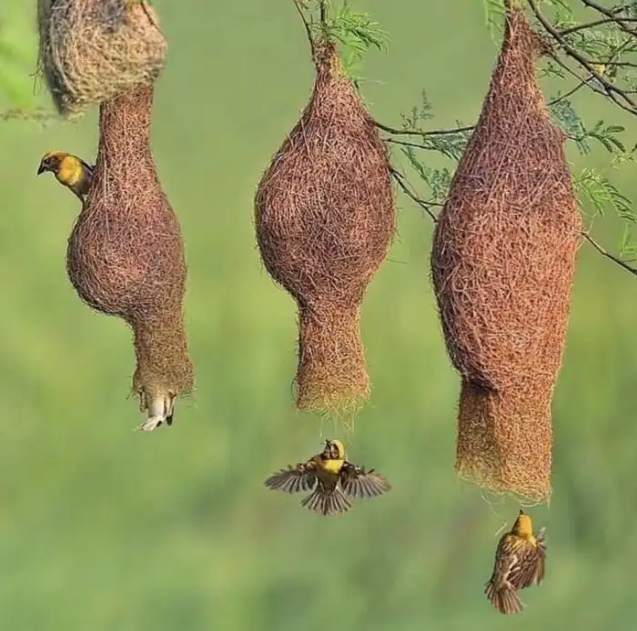 Навыки кройки и шитья пользуются популярностью в птичьем архитектурном обществе не только как средство обороны, но и как основное умение для строительства гнезда. Ткачики Байя, например, плетут себе гнездо из травы и сухих стеблей. Это архитектурное чудо выглядит как подвешенная на ветках ваза, но функцию защиты от хищников выполняет безупречно. Элегантное решение непростой задачки.