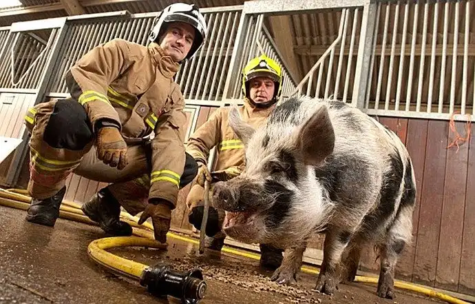 Это Доминик и он – пожарная свинья. Его забрала из приюта местная бригада и теперь отрабатывает на хрюшке приёмы по ловле сбежавших животных.