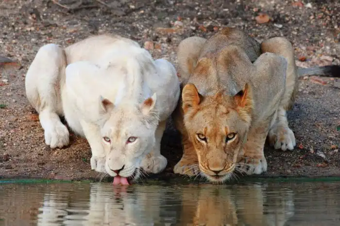 Белые львы и тигры вполне реальны. За экстравагантным окрасом скрывается банальная причина — мутация. Всё дело в сбое выработки меланина, эта штука отвечает за количество чёрного цвета в организме. Он работает как краска в принтере — чем его больше, тем ярче получается окрас у животины.