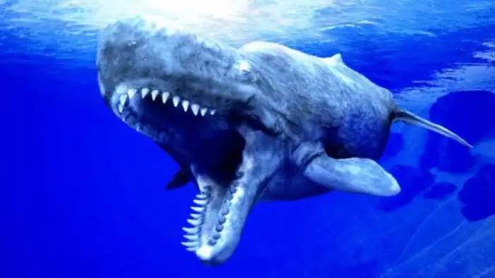 Еще один вид подводных монстров, живших в одно время с мегалодонами. Останки левиафанов поражают воображение. Хищный кит, гибрид касатки и кашалота имел устрашающие размеры – до 17 метров в длину! Из них около трех метров приходилось на огромную голову с широкой пастью, снабженной обоюдоострыми зубами. Каждый клык был длиной до 36 см, а его диаметр в основании достигал 14 см! Даже у хищных динозавров мезозойской эры зубки были помельче.
