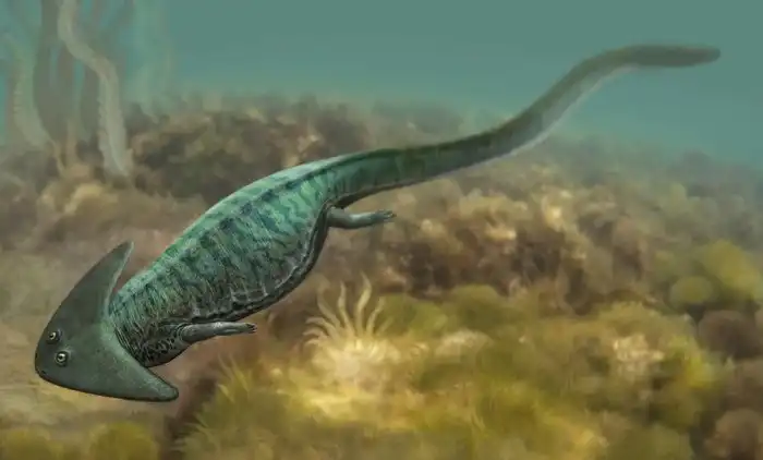 Жили эти бумерангоголовые амфибии, похожие на саламандру, 250-300 миллионов лет назад на территории нынешней США. Чем скотинка так нам интересна? Во-первых, она была достаточно крупной для своих времён — целый метр позитивно улыбающейся земноводной наводил шороху на всю водную и болотную живность тех веков.