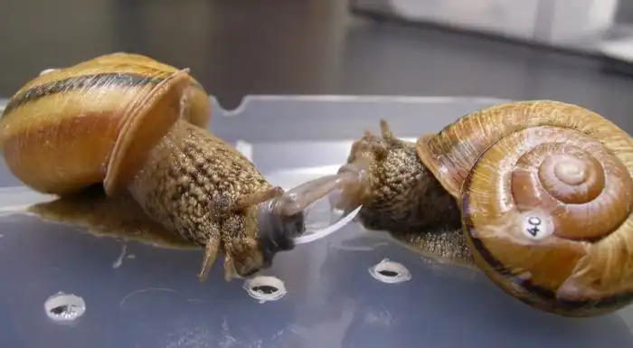 Репродуктивный орган находится у улиток на шее и называется половой порой. В период размножения эта пора набухает, сигнализируя остальным улиткам о готовности дружить организмами. Как только такой «друг» находится, моллюски совершают эдакое рукопожатие — из поры появляется отросток, ими брюхоногие проникают в своего «товарища». Так они обмениваются семенным материалом.