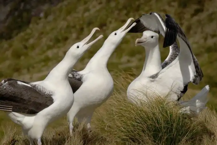 Альбатросы абсолютно не боятся людей, потому что не видят в них опасности. Из 100 птиц от лап хищников погибает всего 3 птицы в год.