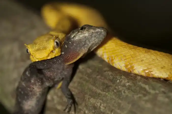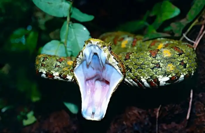 Вообще, будучи интровертами, реснитчатые гадюки ведут скрытный образ жизни и не отличаются агрессивностью. Задаетесь вопросом, как можно вести скрытный образ жизни, обладая неоновой расцветкой? Ну, во-первых, Шлегели очень разнообразны по своему окрасу: среди них встречаются как стиляги желтых и красных оттенков, так и более консервативные особи зеленых и коричневых тонов. А во-вторых, реснитчатые гадюки ведут ночной образ жизни, а в темноте, как известно, все кошки серы.
