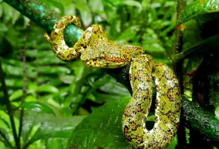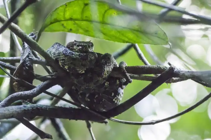 Раз уж речь зашла о маскировке, пришла пора сорвать покров тайны с функции ресничек. Доподлинно неизвестно, для чего они все-таки нужны, но основная теория состоит в том, что реснички змеи используют не для того, чтобы привлекать внимание, а наоборот — чтобы маскироваться. Благодаря расплывчатым очертаниям облик змеи сливается с листвой.