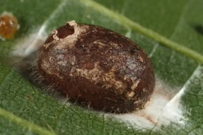 Нет, это не прилипший к листику орешек, это тот самый кокон из которого вылезет бабочка.