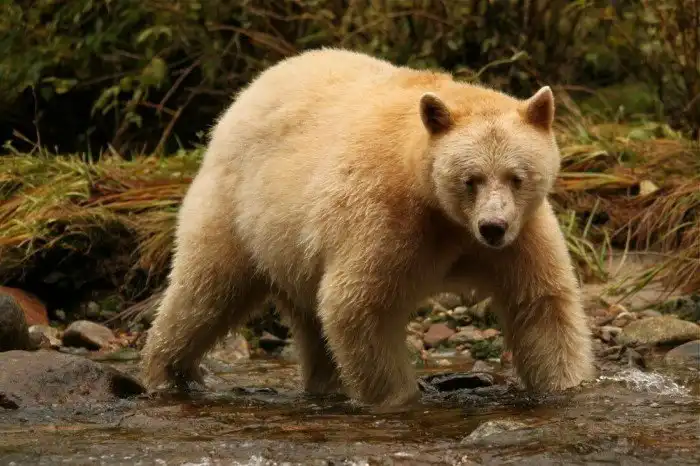 И зря: белый цвет хорошо помогает при охоте на самую вкусную добычу этих мест — лосося. Рыбе намного тяжелее различить белый силуэт на фоне неба, поэтому результативность рыбалки обесцвеченных медведей заметно выше.