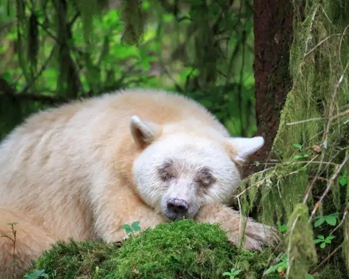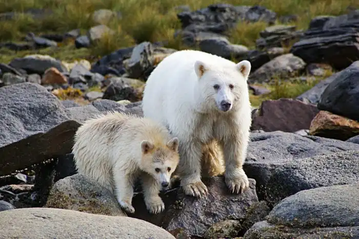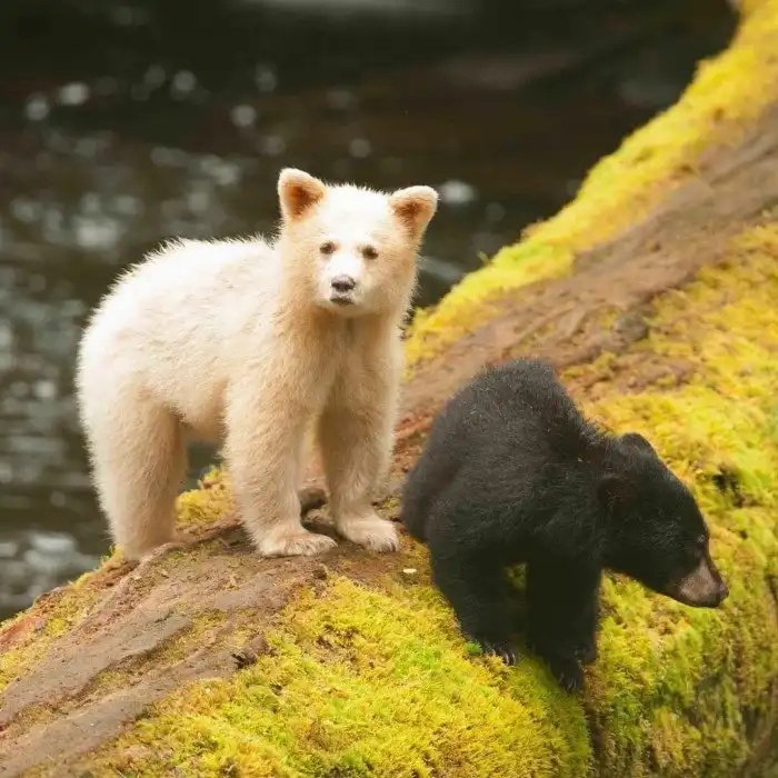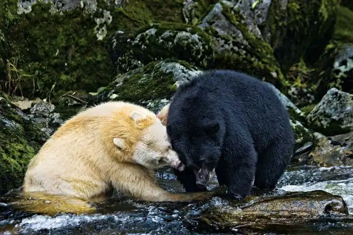 Да, всё верно, это настоящие чёрные белые медведи. Тысячелетия назад в их популяции появилась мутация, преображающая угольно-чёрные меха в янтарно-белые шкуры. На сегодняшний день примерно 10% Кермодских мишек обзавелись светлыми одеяниями, остальные всё ещё предпочитают более традиционные наряды.
