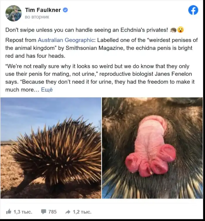 Ехидны - млекопитающие, внешне похожие на дикобразов и обитающие в Австралии, Новой Гвинее и островах в проливе Басса. "Очень странный и необычный" пенис этих зверьков уже долгое время остается загадкой для исследователей, которые до сих пор не понимают, почему у него четыре головки. Тот самый орган составляет треть тела млекопитающего в состоянии эрекции (сама ехидна вырастает до 30-45 см).
