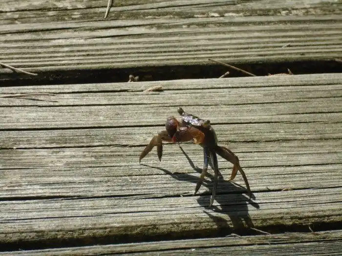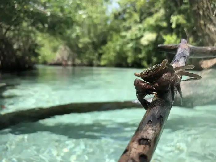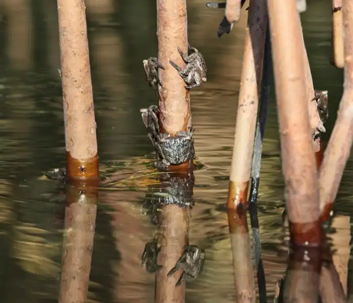 По-хорошему, эта попытка была заранее обречена на провал. Мангры живут по строгому расписанию, которое задают чередующиеся приливы и отливы. Когда вода заливает корни деревьев, в леса заплывают рыбы — не безызвестные любители крабовых палочек. Нормальные крабы отращивают клешни и наращивают панцирь, чтобы защитить свою тушку от угрозы. Но наш герой выбрал другой путь — наверх!