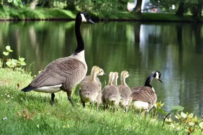 Гусят защищают оба родителя. Даже путешествуя от водоёма к водоёму, птицы охраняют своих птенцов. Впереди идёт первый родитель, а замыкает шеренгу второй. Так птицы смогут точно проконтролировать ситуацию.