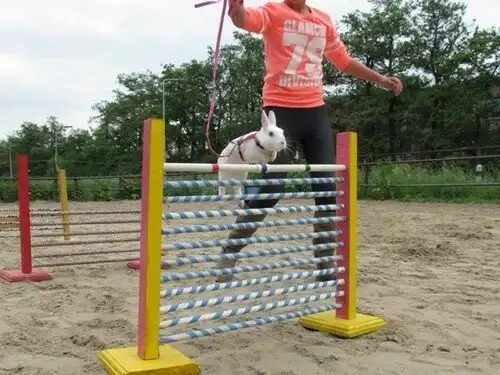 «Карманный конкур» с кроликами вместо лошадей пользуется всё большей популярностью, особенно среди детей. Вместе со своим любимцем хозяин должен пройти в строго определённом порядке составленный курс-дизайнером маршрут («трассу»), обычно от самых простых препятствий до самых сложных. На прохождение трассы обычно даётся фиксированное время (2 минуты). Если кролик за это время не успевает пройти все препятствия, его дисквалифицируют. Если кролик во время прыжка ошибается и задевает барьер, ему записываются штрафные очки. Побеждает кролик, прошедший всю трассу наиболее быстро и без ошибок. Милота, поглядите сами: