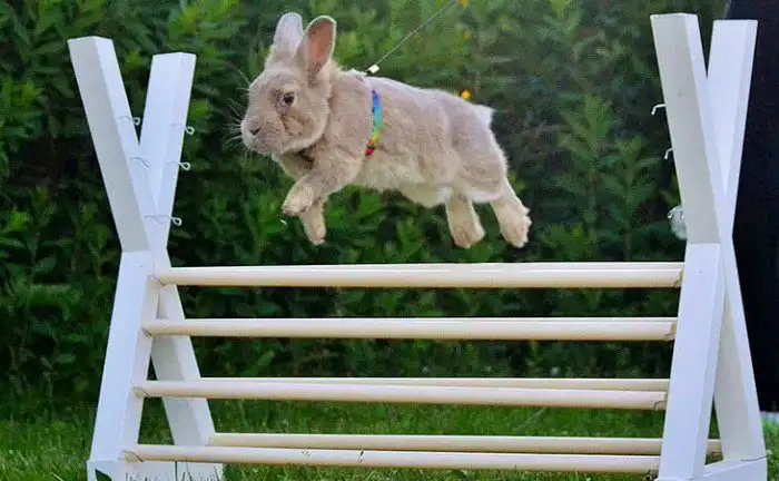 В конкуре всадник, как известно, сидит на лошади в седле. «Скаковые кролики» бегут рядом со своим «тренером» (хозяином) для длинном поводке со шлейкой. Пушистая милота оказалась, представьте себе, очень даже «спортивной»! Мировой рекорд прыжка в высоту – 1 метр 6 сантиметров – был установлен в 2019 году кроликом по имени Добби из Швеции (хозяйка – Юлия Самсон). Этому же кролику принадлежит мировой рекорд прыжка в длину – 3 метра 1 сантиметр! Вполне серьёзно.