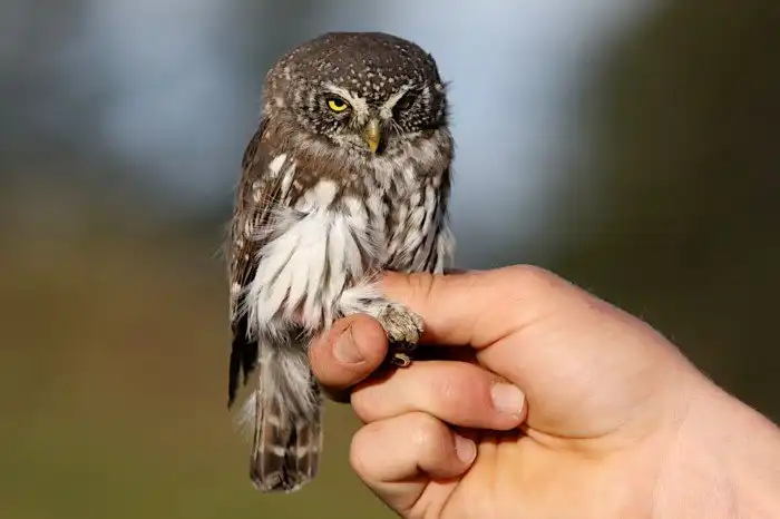 А это воробьиный сыч по имени Профессор. Он живёт дома и ему не нужно думать о собственном пропитании. Везунчик.