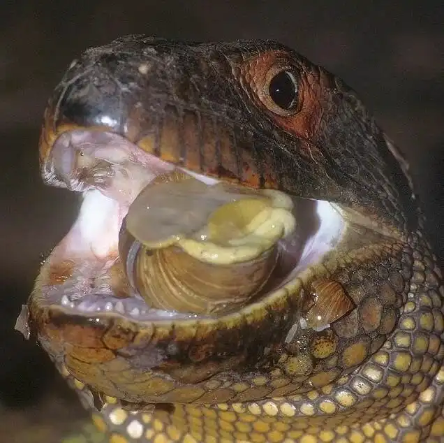 Мощной челюстью молодые ящерки задорно похрустывают раковинами прямо на плаву. Но это ерунда, животинки, что поверили в себя особенно сильно, могут раскусить ракообразное, земноводное, рыбёху и даже небольшую черепаху!