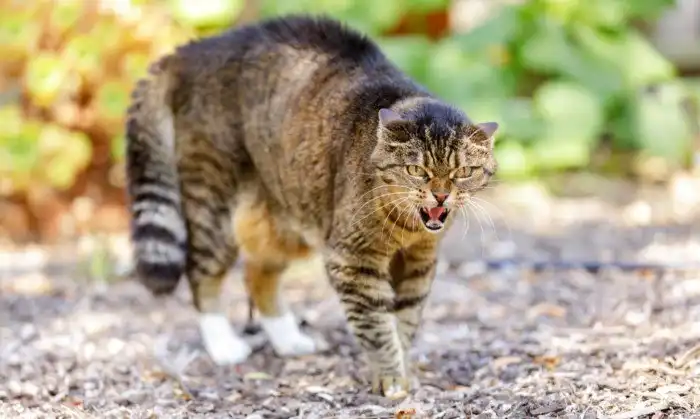 Выгнутая дугой спина — нередкое явление в кошачьем мире. Обычно она свидетельствует о том, что животное напугано, но при это готово атаковать или, по меньшей мере, защищаться.