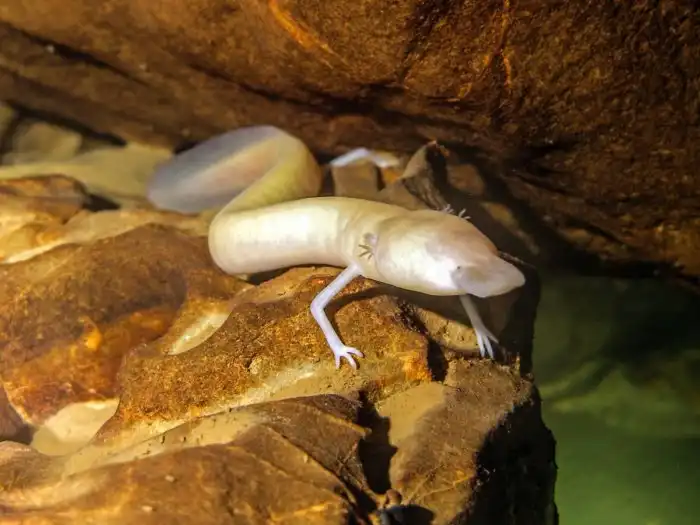 А это протей, таинственная амфибия, которая живёт в пресноводных затопленных пещерах.