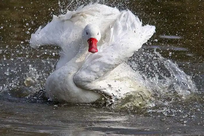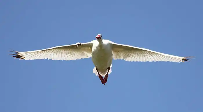 Единственное, что выдаёт в псевдо-лебедях утку — чёрные кончики крыльев. Но их поди — разгляди! Ну и размерами до лебедей утка-косплеер не дотягивает: 4 среднестатистических кило коскоробы не идут ни в какое сравнение против 12 лебединых.