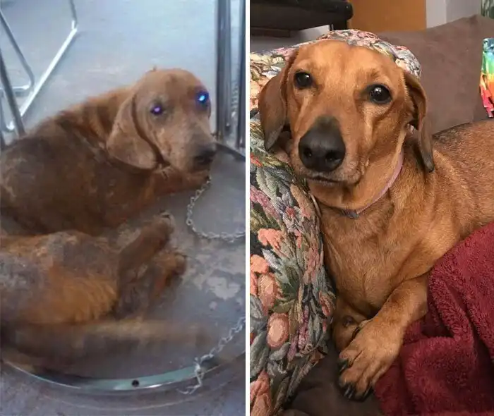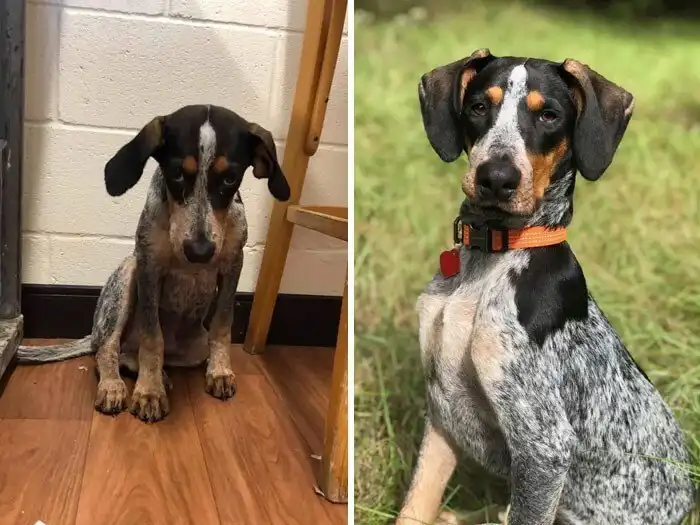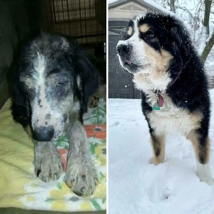 "Первое фото - день, когда мы забрали наше чудо из приюта. Второе - через день, а третье - через неделю"