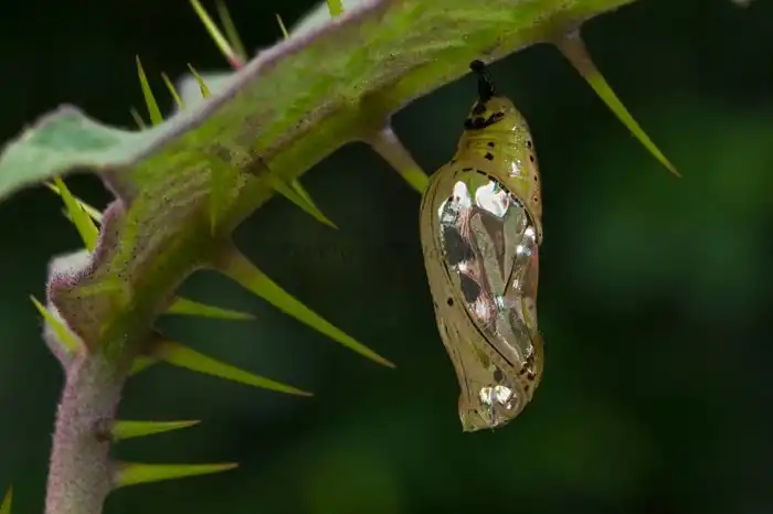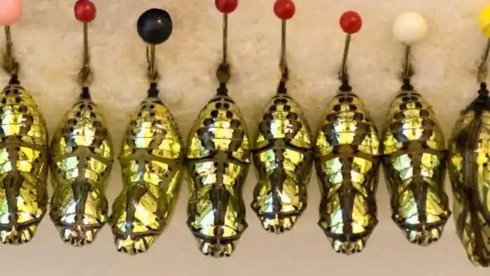 Но между бабочкой и гусеницей есть этап, когда угрожать своей красотой не получится — куколка. В момент превращения насекомые абсолютно неподвижны и беспомощны. Но и тут ушлые чешуекрылые нашли выход. Если гусеницы и бабочки выпендриваются красками, то куколки кичатся золотом!