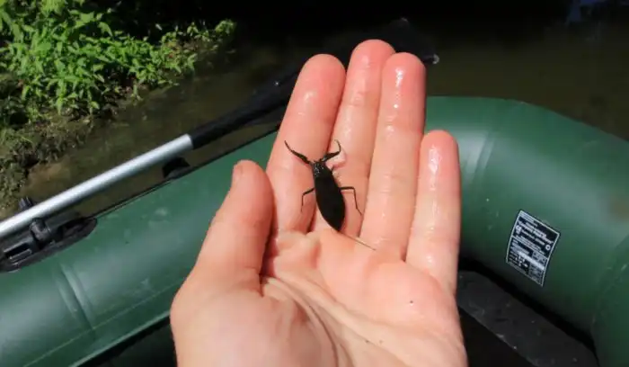 Схватив свою жертву, клоп впивается в неё хоботком и пускает яд. Внутренности соразмерной добычи он превратит в питательный супчик. Ну а вас заставит знатно проораться — укус водяного скорпиона такой же болючий, как пчелиный.