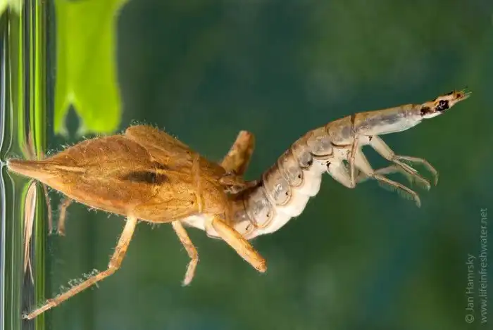 Дети водяных скорпионов отличаются от родителей только размерами. В течение лета маленькие клопчики линяют 5 раз.