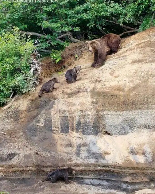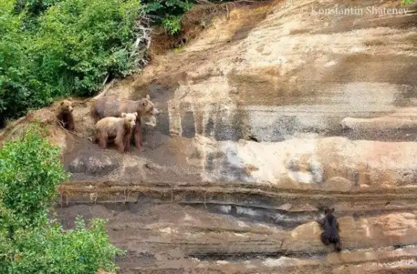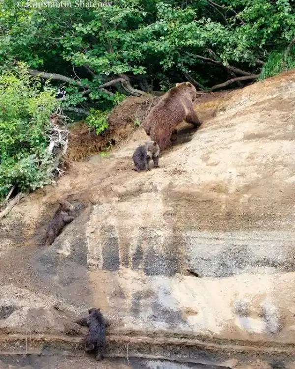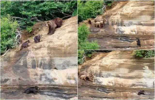 Маленький медвежонок-сеголетка не смог забраться на крутой, обрывистый берег реки. Но он изо всех сил старается подняться. Мама-медведица, с остальными медвежатами переживает и ждёт его наверху, но ничего поделать не может…