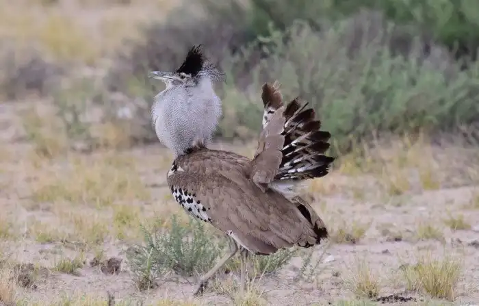Если вы хоть раз видели обыкновенную дрофу, то опознаете и кори. Их обеих объединяет длинная шея, хохолок на голове и прямостоящий веер хвостовых перьев. Но птица с чёрного континента предпочитает более скромные шмотки и заметно крупнее своей северной родственницы. Особенно солидные самцы вырастают до 130 сантиметров, а вот самочкам не повезло, они раза в 2 меньше.