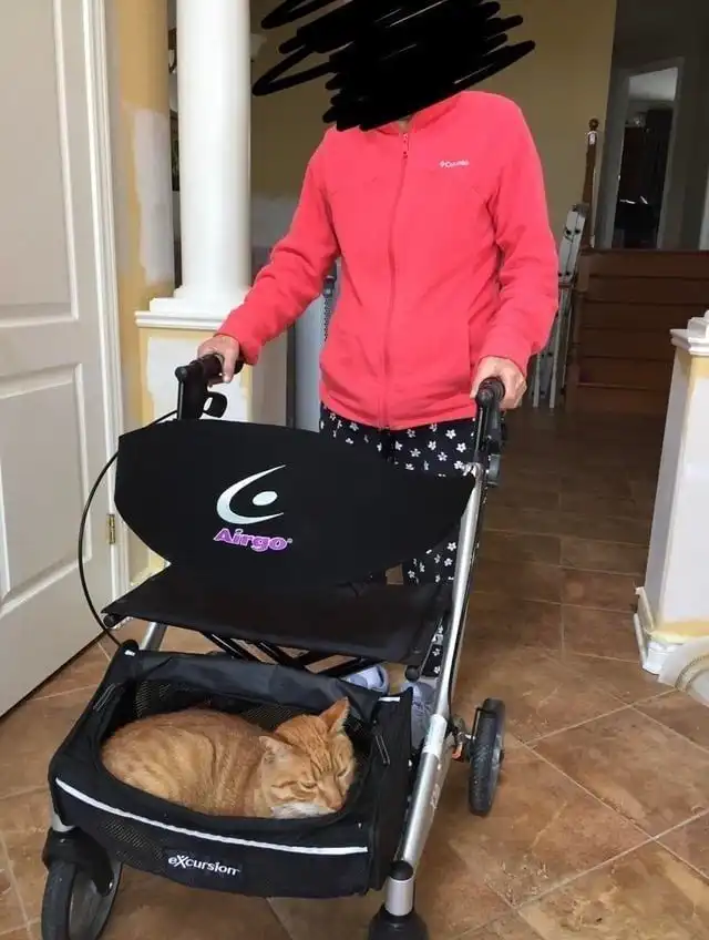 Мою бабулю только что выписали из больницы и она ходит с ходунками. Мой кот ведёт себя как её ленивый телохранитель.