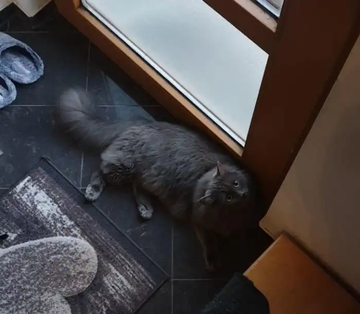 Каждое утро наш кот ложится вот так и блокирует дверь