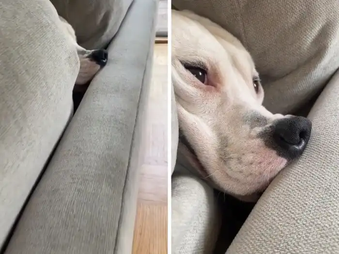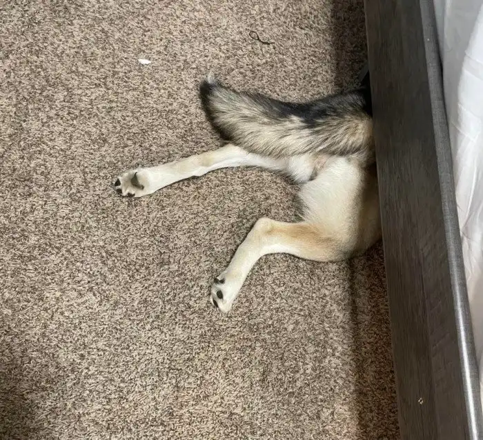 Наш пёс не помещается под нашу новую кровать, но всячески старается под неё пробраться