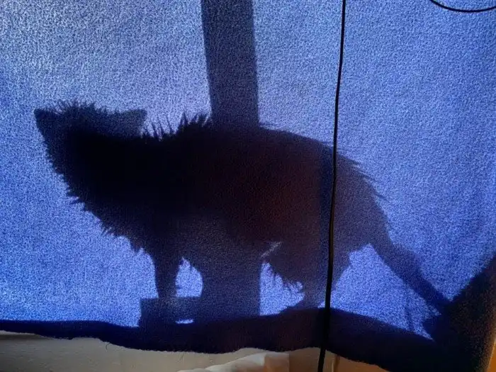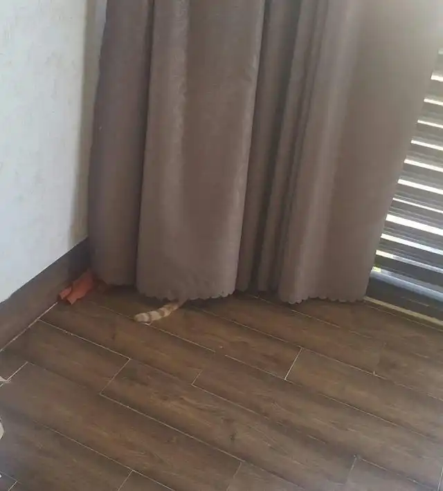 Спрятался за занавеской, но очень громко мяукал