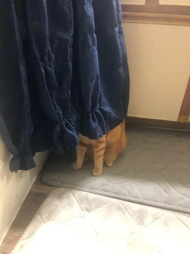 Мой кот спрятался за занавеской после того, как мы его помыли