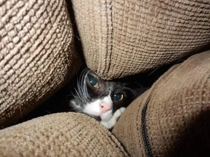 Он прячется среди подушек и пугает гостей.Меня не заметят