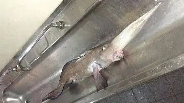 Большие глазки, задорно вздёрнутый носик и широкая улыбка. Будь это человек, всё выглядело бы органично и даже мило. Но на морде рыбы такая гримаса вызывает нервную икоту. Пустой взгляд гигантских окуляров смотрит тебе прямо в душу. Гигантский нос — пика, отросшая на 10 сантиметров. А изо рта виднеются жуткие сросшиеся зубы. Идеальное приспособление, чтобы грызть твёрдую пищу: крабов, морских ежей, человеческие кости...