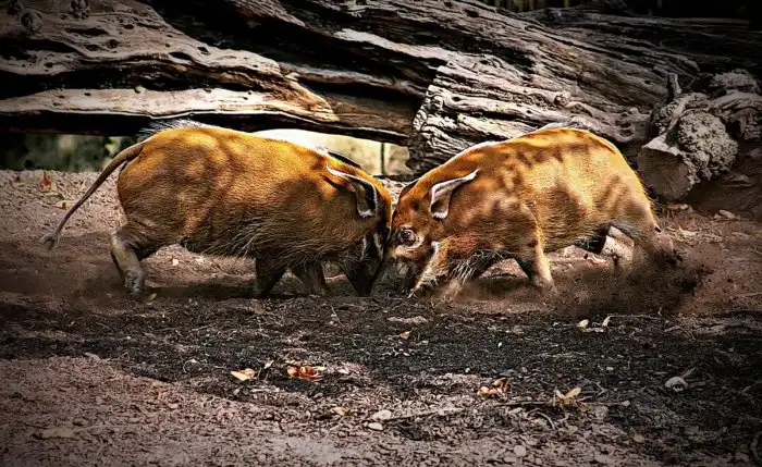 Вообще, при встрече с хищником, кистеухая свинья нападению предпочитает бегство. Но, вот так незадача, людей свинюшка за опасность не воспринимает. К тому же ходит хрюндель не один, а в компании 15-25 себе подобных особей. Такой банде жалкие людишки не страшны от слова совсем.