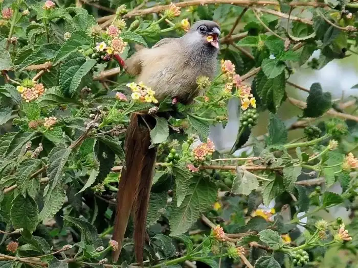 Прописалось это чудо в перьях в Африке. Выглядит птичка также, как грызун-тёзка — невзрачно. Монотонный серо-бурый окрас, длинный хвост (аж в два раза больше, чем тушка), цепкие лапки — как есть мышь, только в перьях.