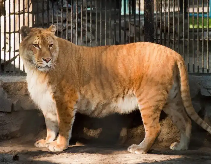 Лигр – это гибрид льва и тигрицы. Внешне необычная кошка похожа на большого, упитанного тигра.
