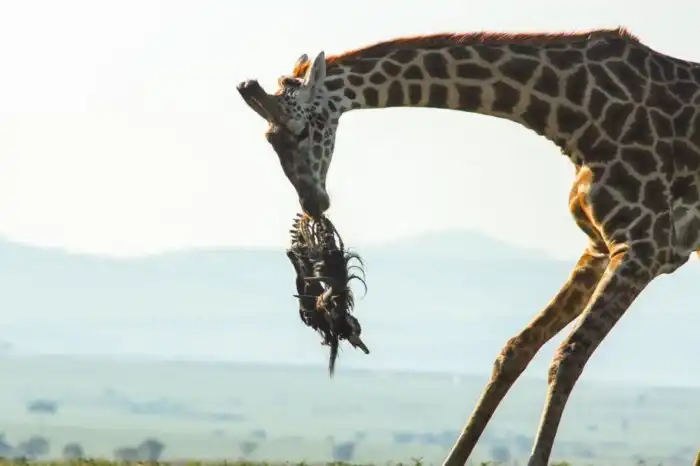 Меланхоличные создания никак не тянут на брутальных хищников. Но в тихом омуте черти водятся. По крайне мере, первое время именно чертовщиной объяснялись кадры, на которых жирафы поедали и подбрасывали тушу антилопы гну. Причём делала это не отдельная особь, а вся группа.