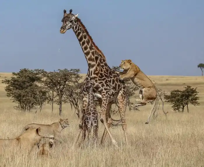 При этом сам жираф тоже может стать обедом. Естественных врагов у него нет: единственный, кто осмеливается нападать на зверину в 6 метров — лев. И тот отлетает в царство Муфассы от одного точного удара копытом.