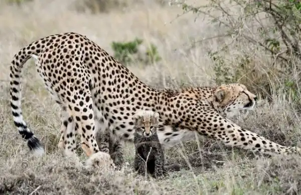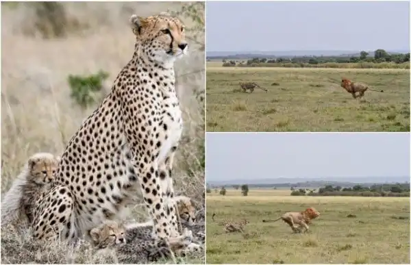 Храбрая самка гепарда прогнала рыщущего льва, в три раза превышающего ее по весу, после того, как он попытался съесть ее детенышей в Кении.