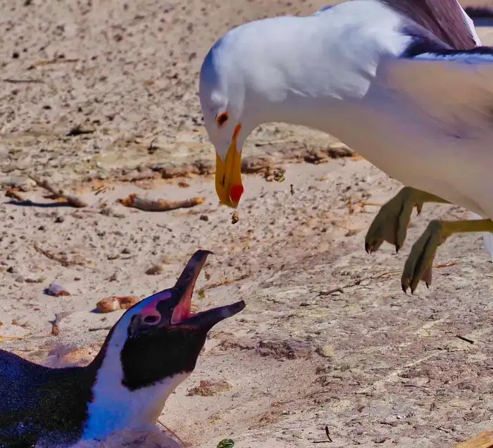 К несчастью, сей оптический девайс не улучшает зрение. А это было бы очень кстати. На суше пингвины видят очень так себе, что крайне опасно для нелетающих птиц, поселившихся в Африке. Каракалы, мангусты и генетты охотятся на птиц-одиночек и устраивают рейды на гнёзда. Чтобы противостоять хищникам, пингвины образуют группы, защищая себя и своё потомство.