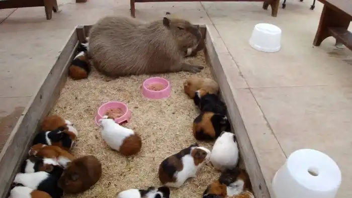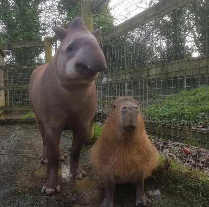 Капибары — самые большие из современных грызунов и выглядят как ну очень хорошо покушавшие морские свинки. Несмотря на то, что это дикие животные, они спокойно относятся к людям и другим зверям. Наверняка вы видели фотографии капибар, которые обнимаются с людьми и позволяют котятам попрыгать по себе. Такие снимки максимально понятно описывают характер этих животных — невозмутимый и даже немного флегматичный.