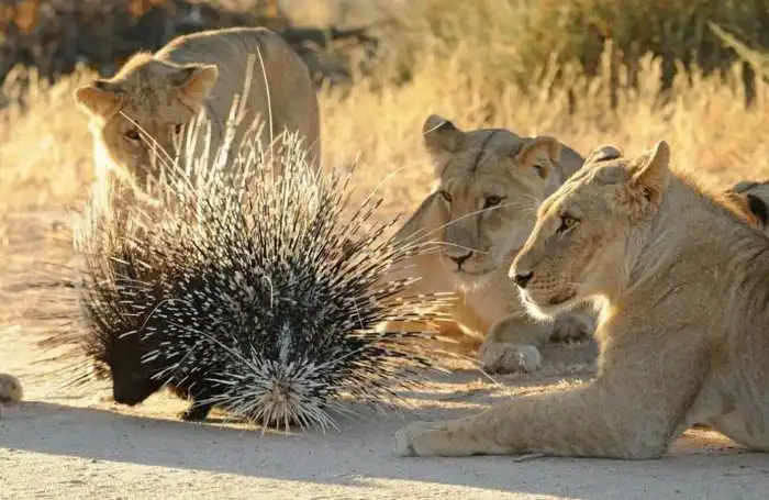 Взрослые хищники сторонятся дикобразов. Но молодые львы очень часто напарываются на иглы и получают очень ценный урок: не трогай колючего крыса.