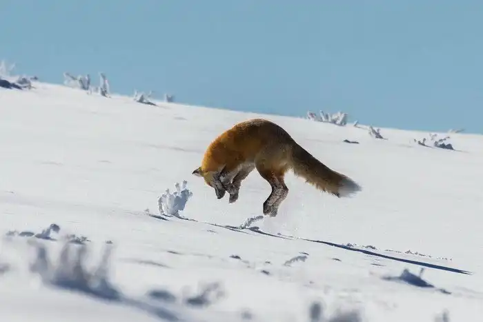 До тех пор, пока снег вокруг рыхлый и не слишком глубокий, охота лисицы заканчивается удачей в 90-95% случаев. Но после малейшей оттепели, снег покрывается коварным настом. Хищнице становится не до шуток. Её знаменитое умение мышковать страдает в качестве. В момент, когда лисица ныряет в сугроб, наст рушится и хрустит. Да и те доли секунды, что требуются на преодоление каверзного препятствия, грызун успешно тратит на побег. Доля удачи снижается.