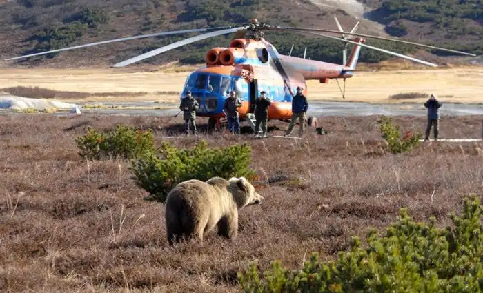 Бурый медведь ожидает отлёта вертолёта, чтобы нанюхаться остатков топлива на месте его посадки.