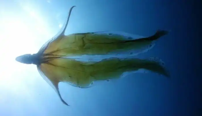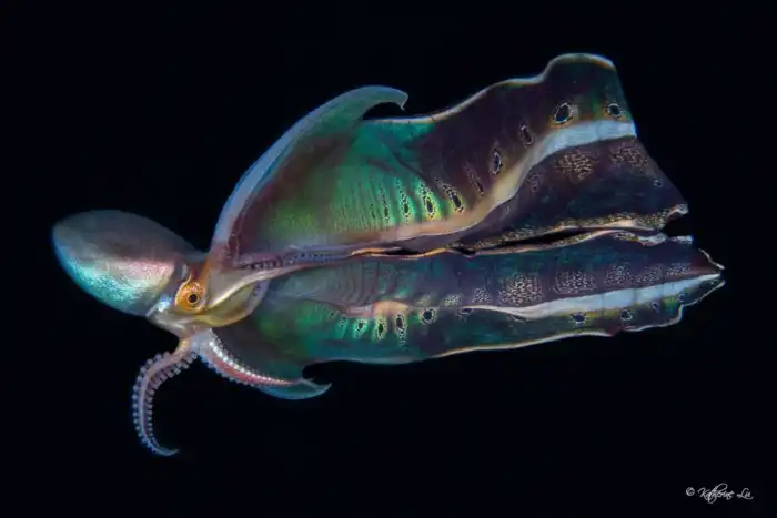 По размерам осьминог идеально ляжет на кровать-евродвушку: его длина достигает 2 метров. В целом, животина выглядит как и другие головоногие моллюски: те же 8 лапок, тот же клюв, те же присоски. Только вот между 4 задними щупальцами у нашего героя растянулась перепонка, которая и превратила его в одеяло.