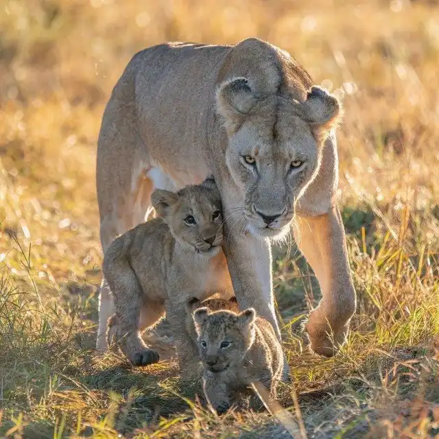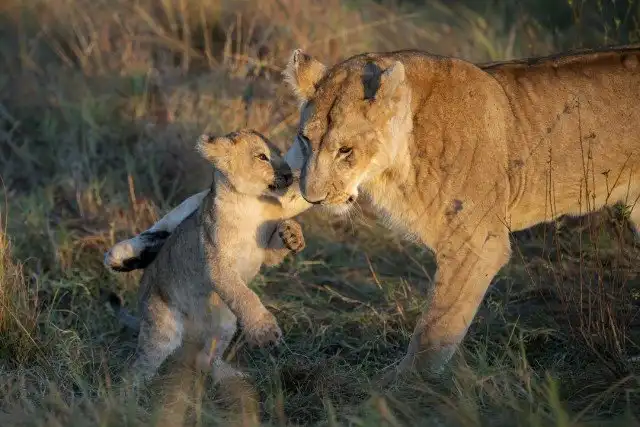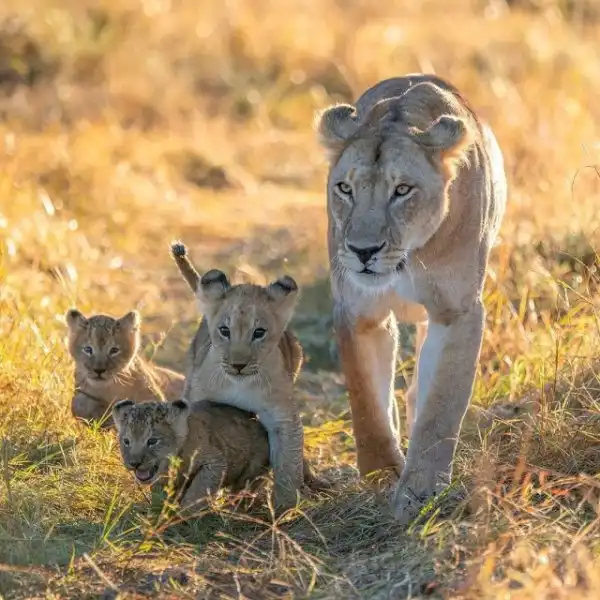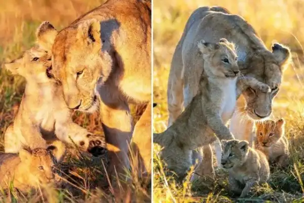 Бабушка-львица была не в настроении веселиться, так как переводила детей в новое логово.